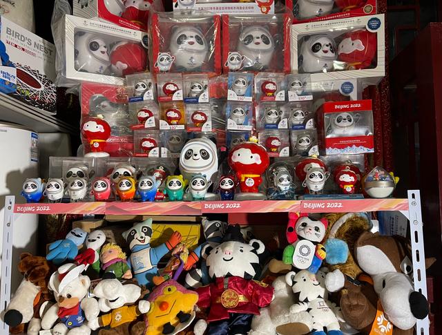 摆放历届奥运会吉祥物的架子上,一套五颜六色冰墩墩盲盒十分醒目。