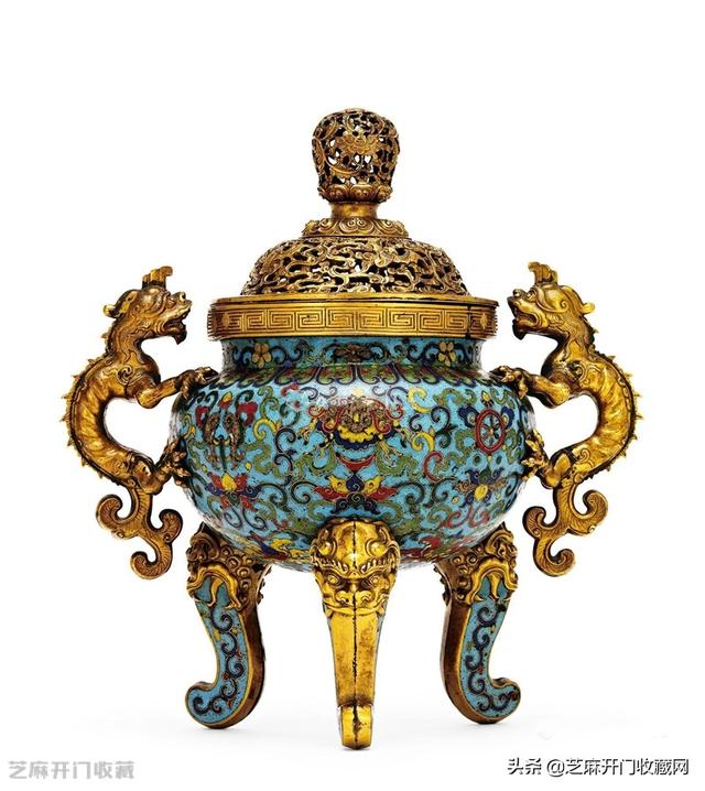 3:清乾隆铜胎掐丝珐琅双螭龙耳熏炉,尺寸:高30厘米,估价:RMB 500,000 ~ 600,000,成交价: RMB 575,000