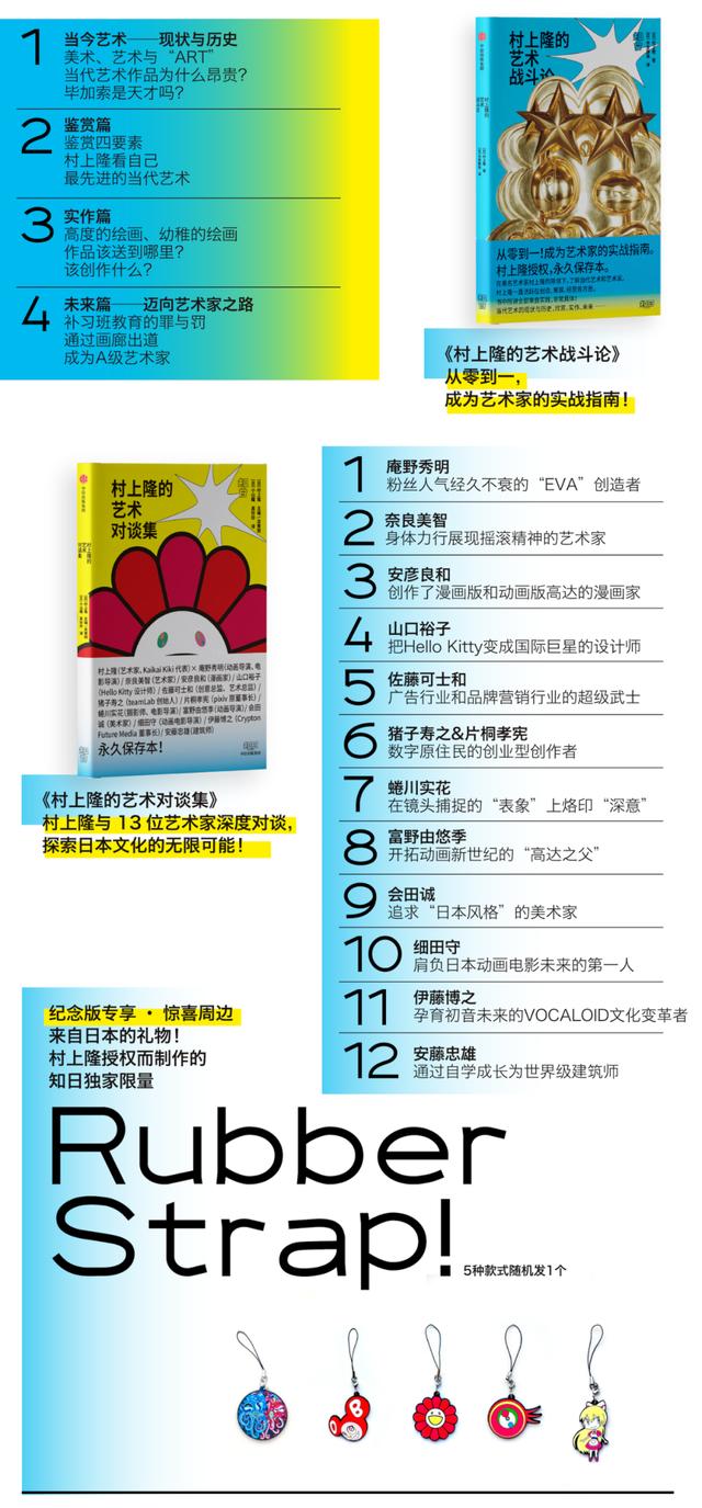 在《村上隆的艺术》纪念版套装里,你不仅可以从全方位了解村上隆、感受到最新的艺术潮流,还有纪念版专享收藏周边挂饰,一共5种款式随机盲盒赠送!每一个挂件都由村上隆亲自监制、把关。