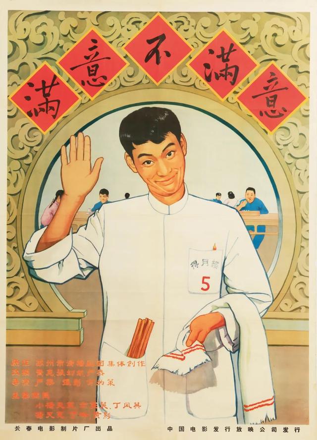 1963年严恭导演的电影《满意不满意》,由苏州市滑稽剧团同名滑稽戏改编。其海报也带有滑稽戏夸张的脸谱化特点,画面取自影片末尾的最后一个镜头,正是“得月楼”餐厅5号服务员杨友生微笑相送顾客的场景。海报设计得非常巧妙,因为杨友生笑容的背后有太多的故事,也包含着一种服务观念的变迁。从画面上,我们可以明显看出小杨师傅的笑体现的双重含义,一是源自自己从工作中获得的成就感;二是源自顾客表扬他的服务时,他还很不好意思。无论哪种,这都是杨友生发自真心的笑容。通过这个笑容内涵的转换,海报很好地反映出电影想要表达的内涵。