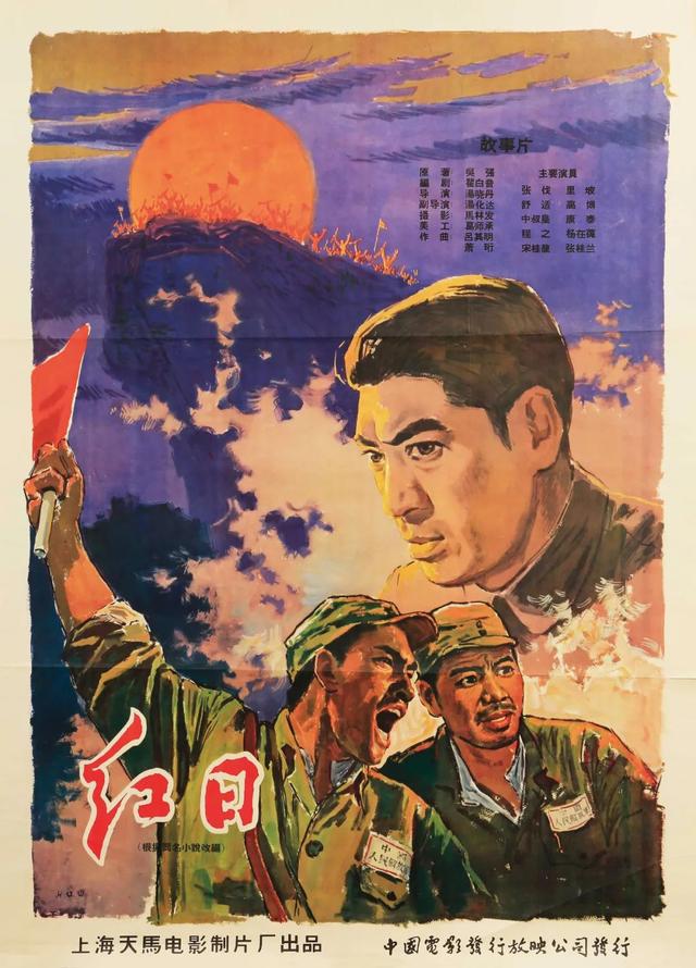 1963年汤晓丹导演的电影《红日》,其海报是新中国电影海报中精品之作。在高高的山巅之上,英勇的解放军经过浴血奋战,在胜利地山巅上欢呼,一轮红日喷薄而出,迅疾跃腾向上,映衬着绚丽的朝霞。军长沈振新紧锁眉头、凝神思索的形象置于画面中部,团长刘胜、连长石东根二人位于画面下方,神色各异,特别是知名演员杨在葆扮演的连长石东根高举着红旗,呐喊着冲锋的形象折射出孟良崮战役的激烈和白热化。整个画面气势磅礴,人物刻画逼真细致。