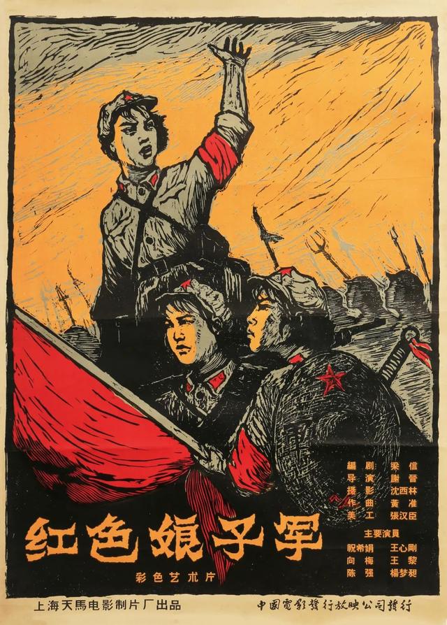 以1961年谢晋导演的电影《红色娘子军》为例,这部电影先后创作出几种不同艺术风格的电影海报,其中最为经典的一幅是木版画风格的。此幅海报据一幅五色木版版画为底本印刷,分别为黑、灰、洋红、粉色、橘色,以自然独特的视觉美感,再现了红色娘子军意气风发、勇往直前的战斗景象,极具艺术创造力和震撼感。橘黄色的背景似冲天烈火,宣示着旧世界的焚毁;红星、红领章、红袖标、红旗点缀其中,甚为夺目;而粉色的片名又体现出女性的色彩。吴琼花高举拳头的姿势,带有强烈的仪式感与感召力,引导着娘子军战士踏上新征程。她坚毅果敢的表情,显示出巾帼更胜须眉,为画面平添了革命浪漫主义色彩。画面上那乐观、积极的奋发姿态,使民族自信心通过图像视觉修辞的方式呈现,“向前进”的动感跃然纸上,呼之欲出。