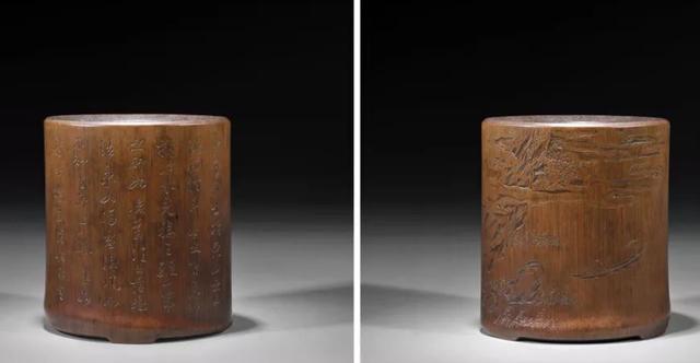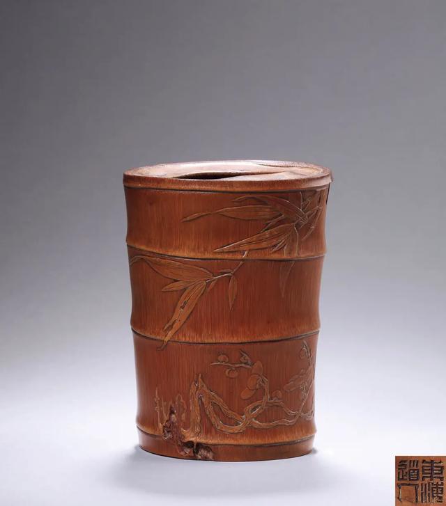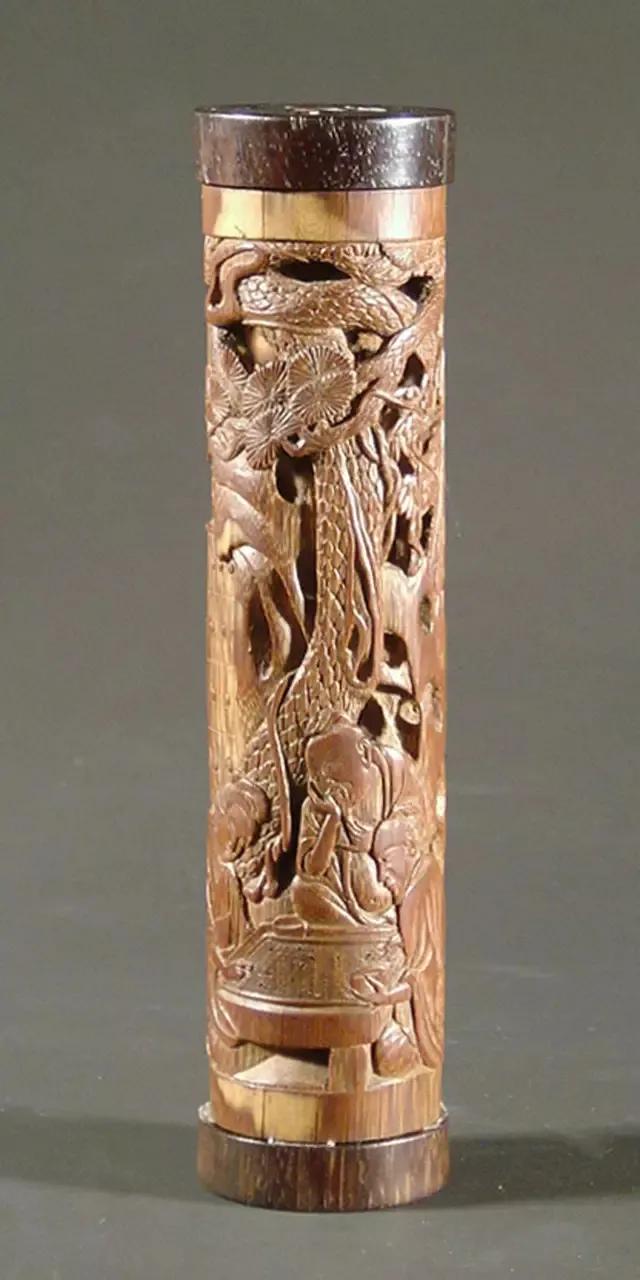 乾嘉以后,文人多乾嘉以后,文人多喜爱篆刻,甚至亲自奏刀。因此竹刻家中不乏文人雅士。潘西凤号老桐,操刀刻竹,为了从困顿的生活中解脱出来。因此,他以文人的雅逸审美,摒弃雕饰,用浅刻手法求天然浑成之妙。所刻的臂搁,全无雕饰,用畸形卷竹裁截,竹上虫蚀斑痕宛宛可见,令人疑其未经人手。其雕笔筒,取土下数节略加裁刻,给人一种天然趣成的圆熟。由于受世风影响,饱学之士的老桐,刀下篆隶,得秦汉遗法,淳古浑劲,呈刻于竹上,一派高古绝俗之气。
