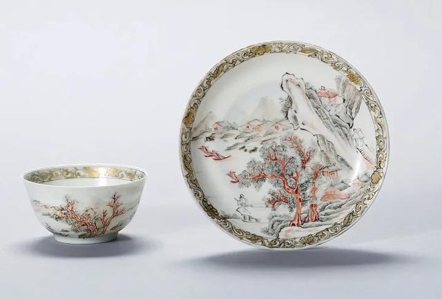 杯撇口,深腹,圈足,底部施釉,无款,纹饰同碟。此套杯碟胎质轻薄,构图有国画气象,为雍正后期广彩山水题材佳作 。
