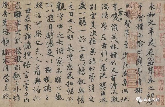 乾隆四十四年,皇帝命将内府珍藏的虞世南、褚遂良、柳公权和冯承素所摹的《兰亭序》四个真本,《戏鸿堂帖》中“柳公权书兰亭序”原刻本、于敏中奉旨为这个原刻本填补阙笔的全本、董其昌的《兰亭序》临本,以及乾隆手临董其昌《兰亭序》本--一共八种《兰亭序》本墨迹刻石,名“兰亭八柱”。