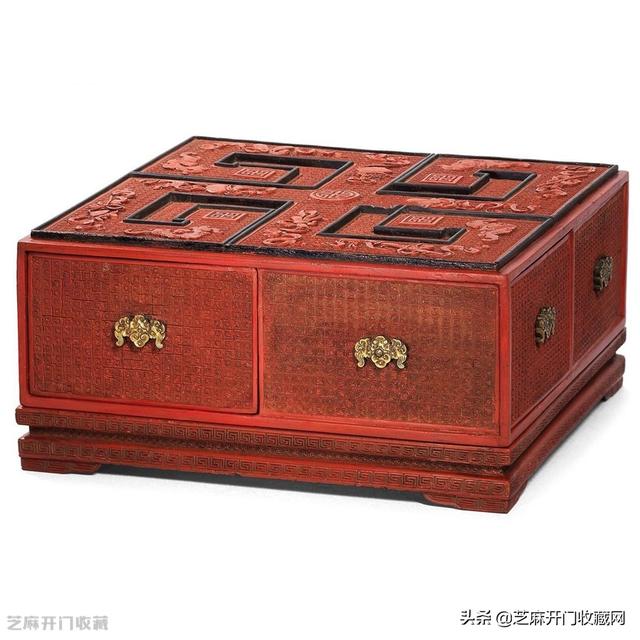 4:清乾隆剔红暗八仙云蝠万寿纹正方宝盒连底座,尺寸:square23.2厘米,成交价: HKD 812,500