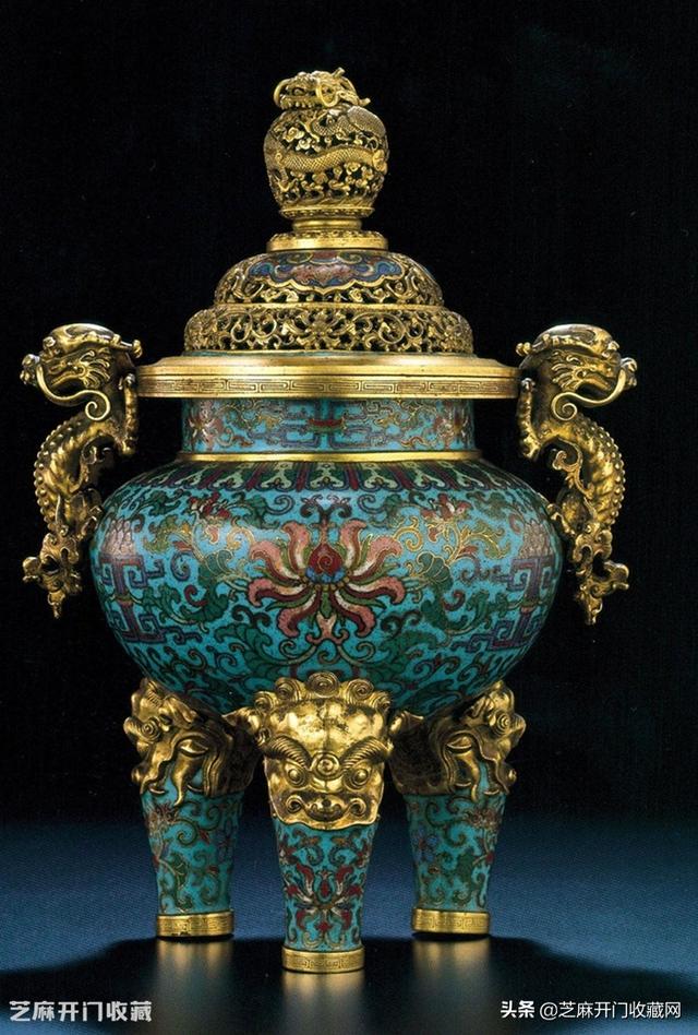 3:清18世纪掐丝珐琅莲纹龙耳三足盖炉,尺寸:高35.5厘米,估价:HKD 700,000 ~ 900,000,成交价: HKD 860,000