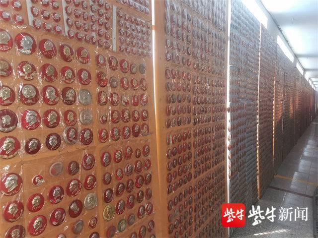 历程章、诗词章、套章……孙建本的收藏馆在常州西郊厚余村,整整3000多个平方米,墙上、橱窗内摆满了各种风格和材质的毛主席像章,琳琅满目,令人目不暇接。