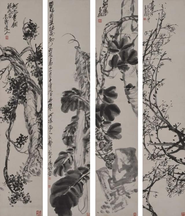 吴昌硕 《芭蕉松梅》 四条屏 1916 年 纸本水墨 各纵 134.5 厘米,横 27 厘米
