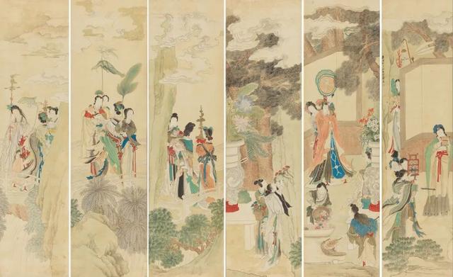 任熊 《瑶池祝寿图》六条屏 1850 年 绢本设色 纵 172 厘米,横 280厘米